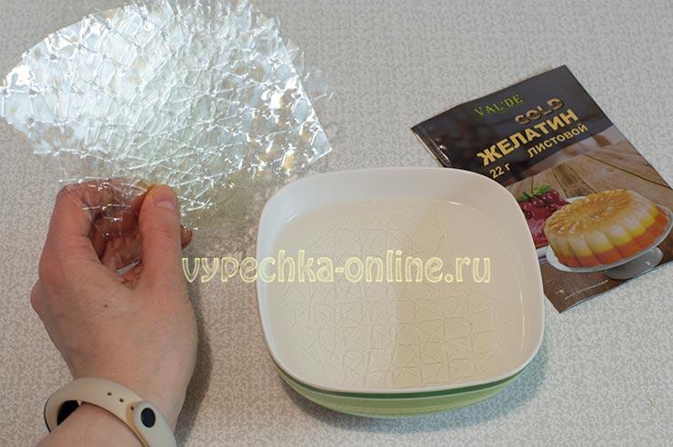 На этом этапе нужна вода — чем холоднее, тем лучше. Я заранее ставила её в холодильник. Затем достала, опустила в неё желатин, чтобы полностью покрывала его. У меня 3 листа по 2 грамма.