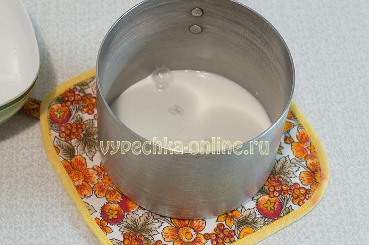 - Молоко довела до кипения. Желатин хорошенько отжала и выложила к нему. Тщательно размешала ложкой, дала остыть до тёплой температуры.